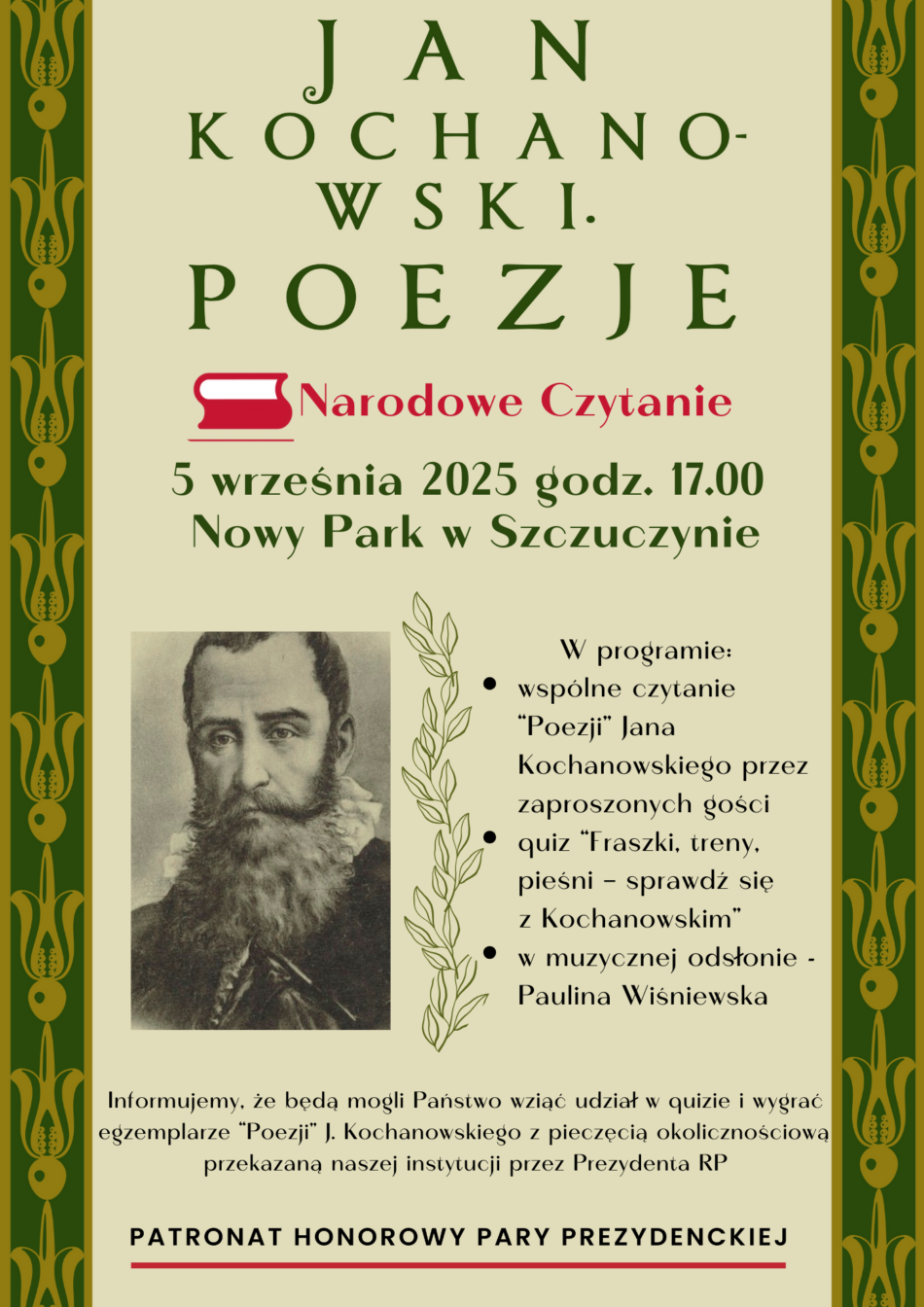W tym roku czytamy poezję Jana Kochanowskiego – w muzycznej odsłonie wystąpi Paulina Wiśniewska, a Waszą wiedzę sprawdzimy w quizie: „Fraszki, Treny, Pieśni – sprawdź się z Kochanowskim!”