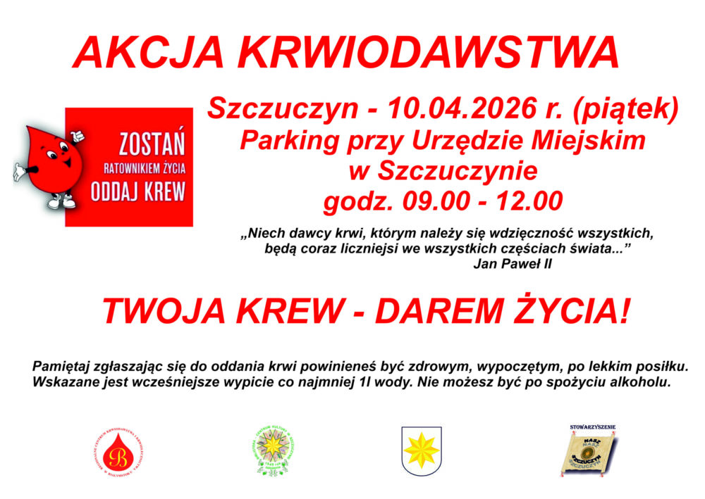 Stowarzyszenie Nasz Szczuczyn, Biblioteka – Centrum Kultury w Szczuczynie, Urząd Miejski w Szczuczynie, i Regionalne Centrum Krwiodawstwa i Krwiolecznictwa w Białymstoku Oddział Terenowy w Łomży zapraszają mieszkańców Szczuczyna i regionu do udziału w akcji krwiodawstwa, która odbędzie się 10.04.2026 r. (piątek) w godz. od 9 do 12:00.