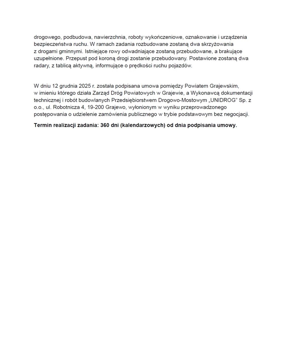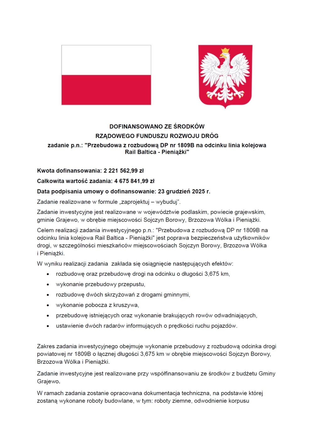 Informacji o podpisaniu umów na dofinansowanie zadań inwestycyjnych Powiatu Grajewskiego: