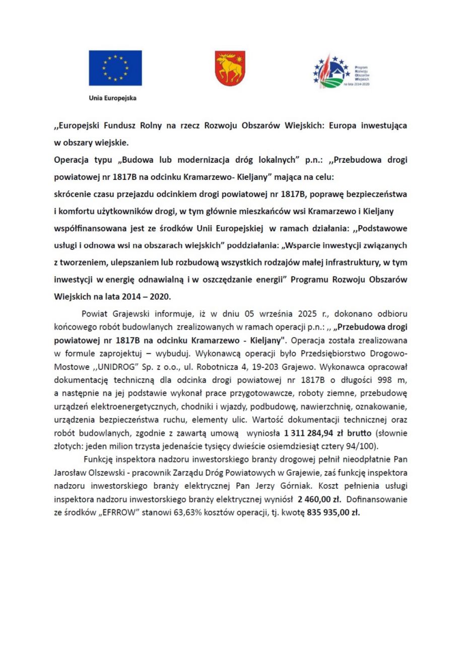 Dzisiaj, 5 września 2025 r., dokonano odbioru końcowego robót drogowych zrealizowanych w ramach zadania inwestycyjnego pn. „Przebudowa drogi powiatowej nr 1817B na odcinku Kramarzewo – Kieljany”.