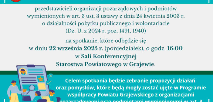 przedstawicieli organizacji pozarządowych i podmiotów wymienionych w art. 3 ust. 3 ustawy z dnia 24 kwietnia 2003 r. o działalności pożytku publicznego i wolontariacie (Dz. U. z 2024 r. poz. 1491, 1940) na spotkanie, które odbędzie się w dniu 22 września 2025 r. (poniedziałek), o godz. 1600 w Sali Konferencyjnej Starostwa Powiatowego w Grajewie.