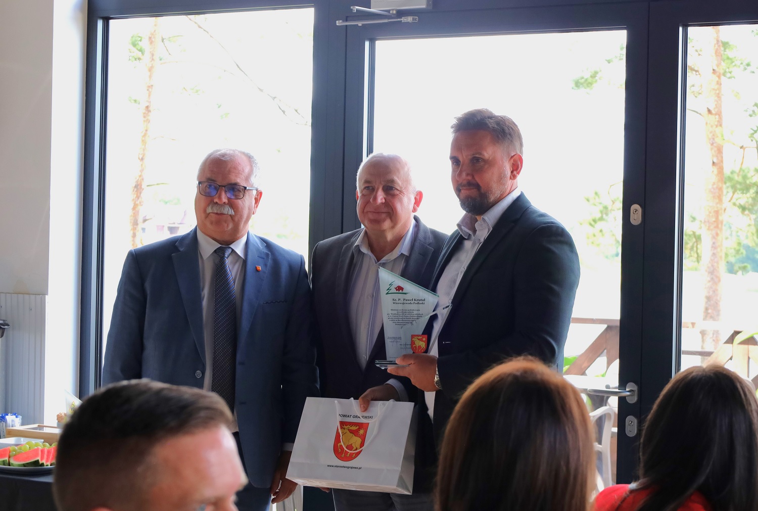 Podczas wydarzenia Starosta Grajewski wraz z Przewodniczącym Rady Miejskiej w Rajgrodzie podziękowali osobom, które wspierają rozwój powiatu. Słowa uznania skierował do Wicewojewody Podlaskiego Pawła Krutula za pomoc finansową przy realizacji inwestycji, do Prezesa PD-M w Piszu Edwarda Maciejewskiego za sprawne wykonanie zadania, a także do członka Zarządu Województwa Podlaskiego Jacka Piorunka za obecność i wsparcie różnorodnych działań podejmowanych na terenie powiatu. Podziękowania od Starosty otrzymał również sam Przewodniczący Rady Miejskiej w Rajgrodzie Jarosław Matysiewicz za dobrą współpracę między samorządami.