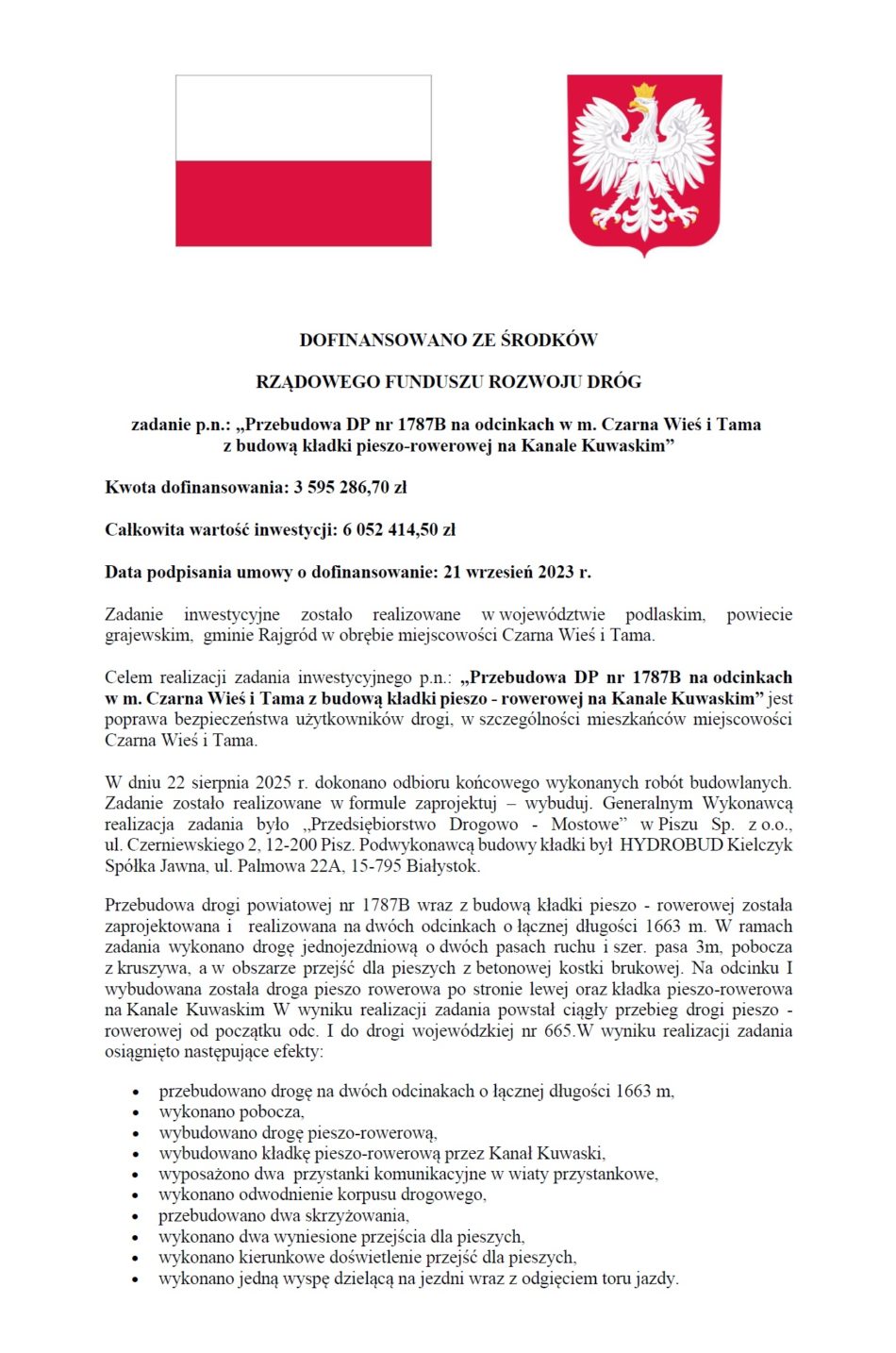 22 sierpnia 2025 r. odbyło się uroczyste otwarcie drogi powiatowej w ramach zadania pn. „Przebudowa DP nr 1787B na odcinkach w m. Czarna Wieś i Tama z budową kładki pieszo-rowerowej na Kanale Kuwaskim”.